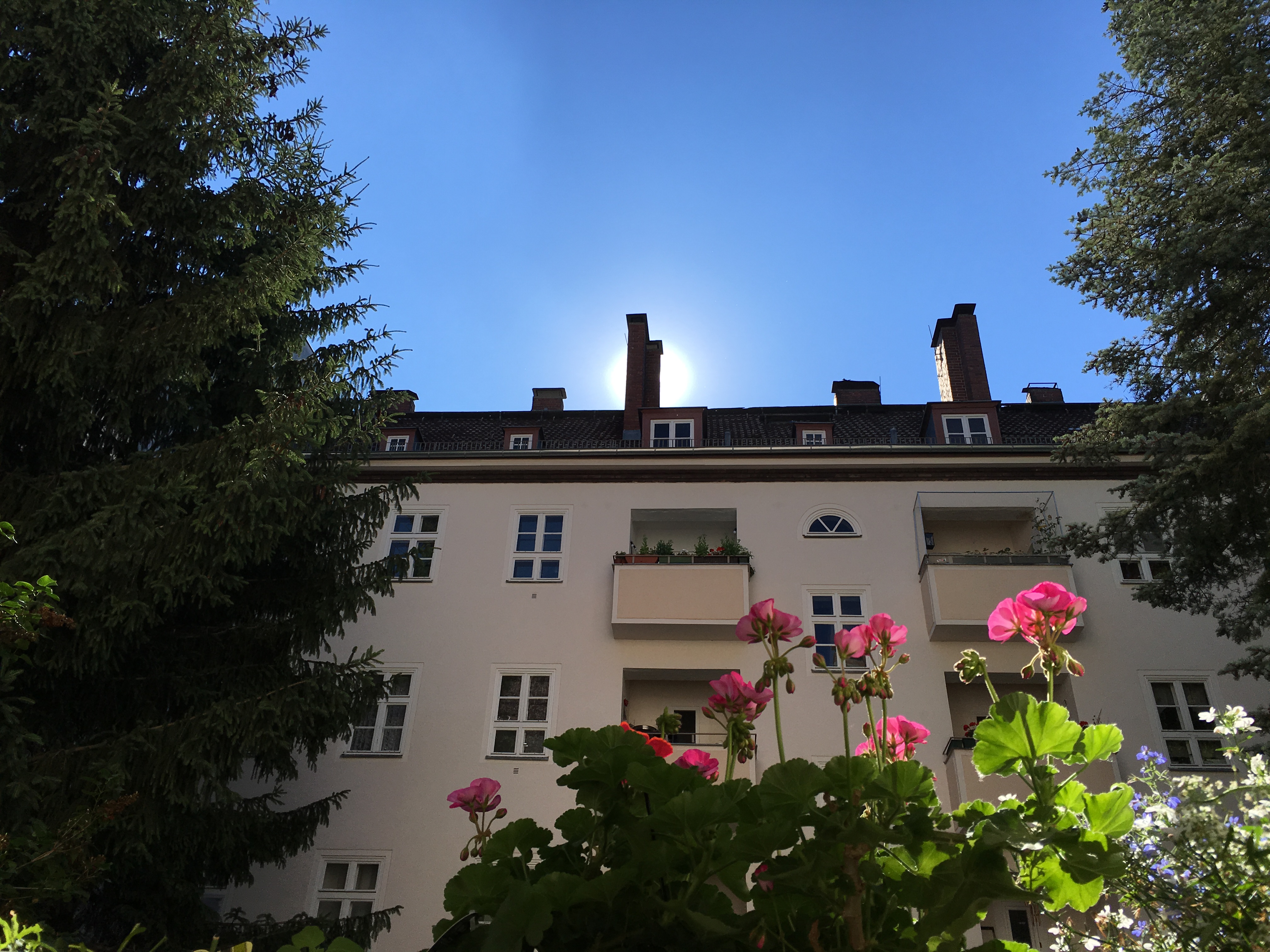 Betörender Sonnenaufgang im Sommer auf dem blumigen Balkon eines Berliner Hinterhofs lĂ€d zum inspirierenden Nachdenken ein... laĂ' dich entfĂŒhren von dieser Stimmung und AtmosphĂ€re eines Moments, der einen Hauch von Ewigkeit zu verheisen scheint.