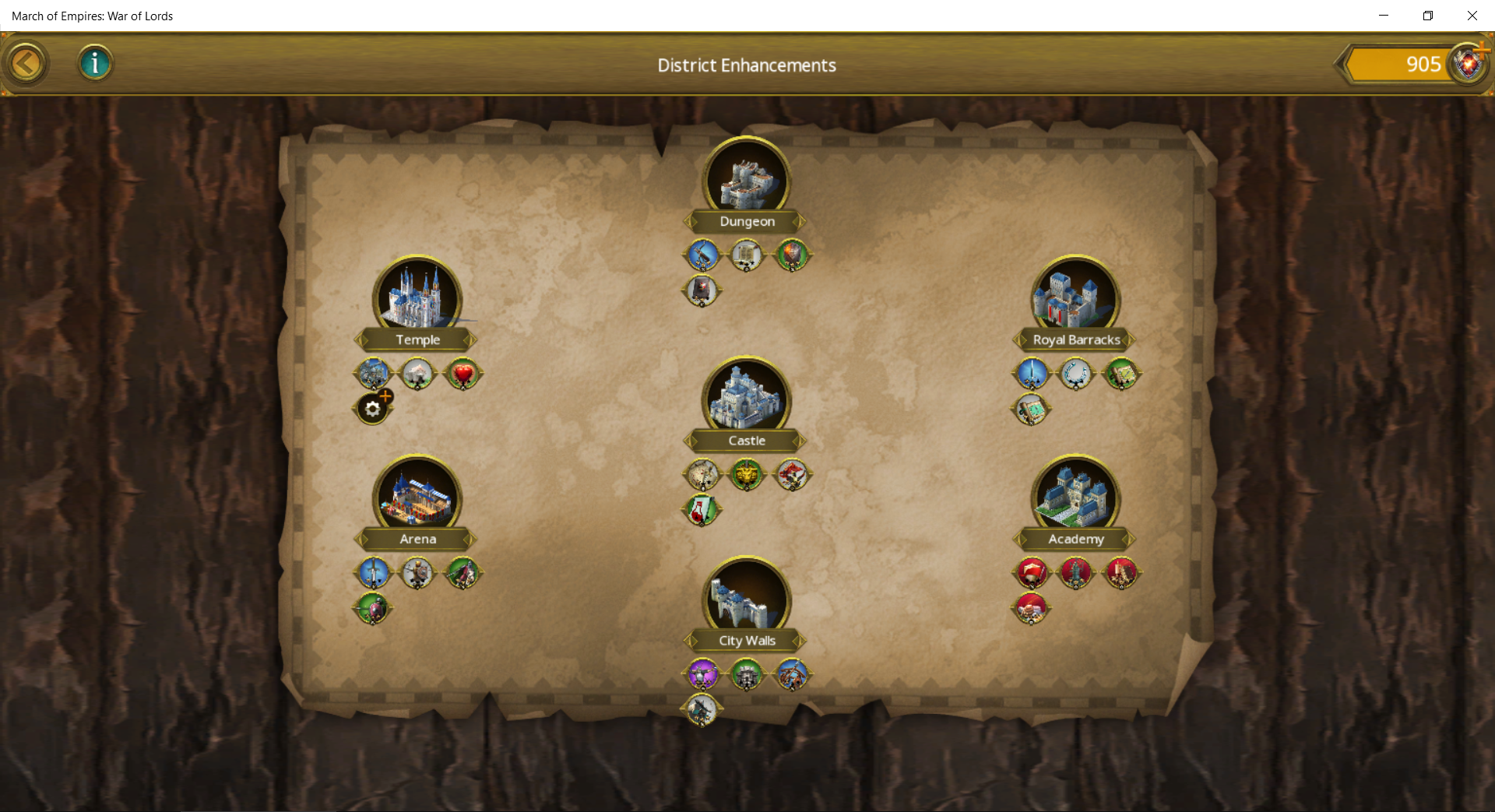 In District enhancements You need to level-up all items in Academy first. In top level with red color have to be Research, March size vs. Encounters, Resource Income, Resource Capacity, Attack vs. Encounters and Health vs. Encounters. Then you are strong and powerful enough to fight Encounters/Camps every day to earn millions of gold. This is the trick and tactic to grow fast.