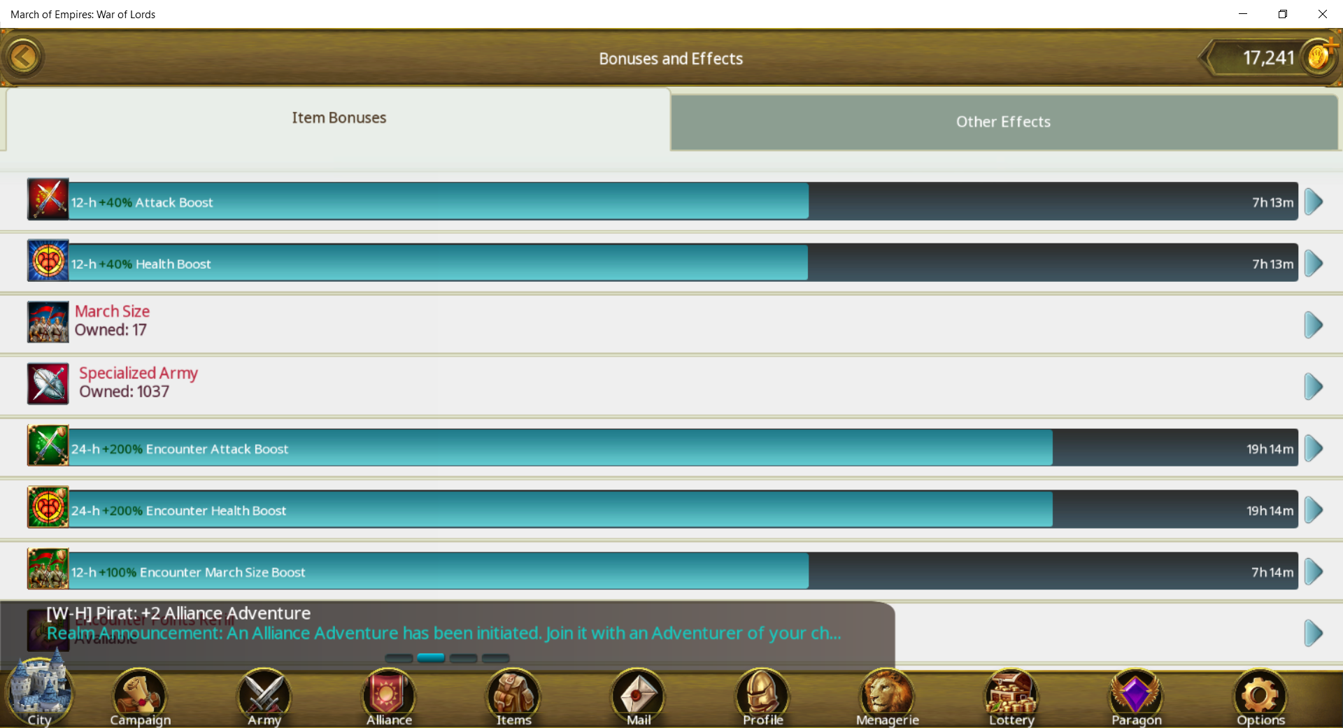 Daily active boosters for encounters, warpath, battering ram (Fridays), tournament, gladiator arena, and much more.