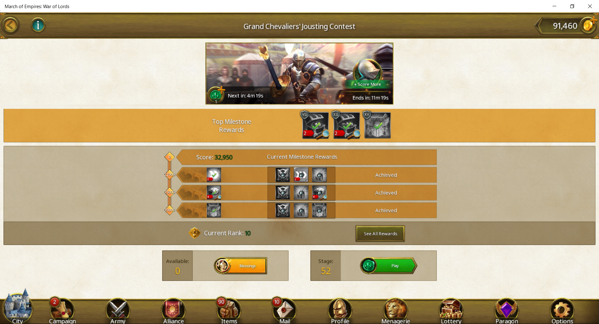 Grand Chevaliers' Jousting Contest - Reaching Rank 10 in Stage 52 - March Of Empires - War Of Lords