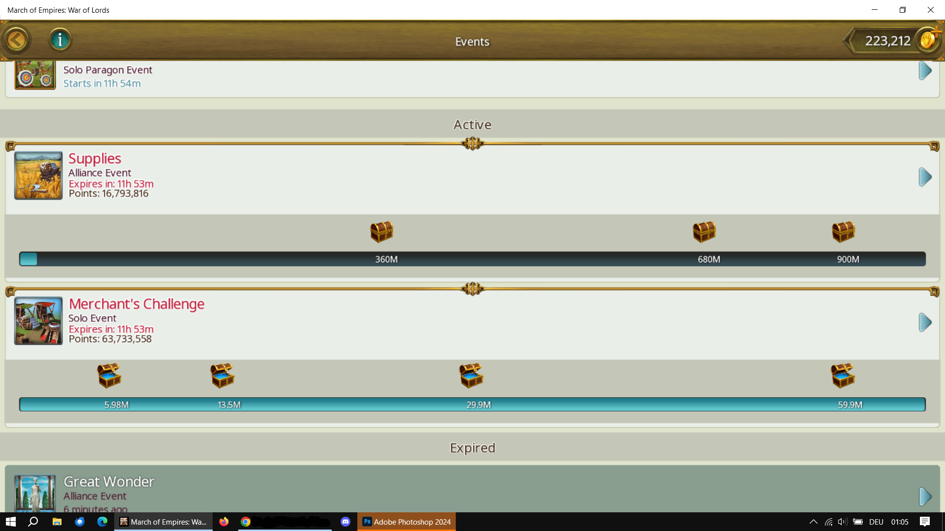 Event Merchant's Challenge - Event successfully solved after 3 minutes. You can see the evidence in the clock of Windows' interface (right bottom) and in the text of the event. The event started at 1.00 am GMT+1, and I finished 3 minutes later at 1.03 am GMT+1. You see 1.05 am GMT+1 for reason that I changed the game's language from German to English and started Adobe Photoshop in order to save the Screenshot.
