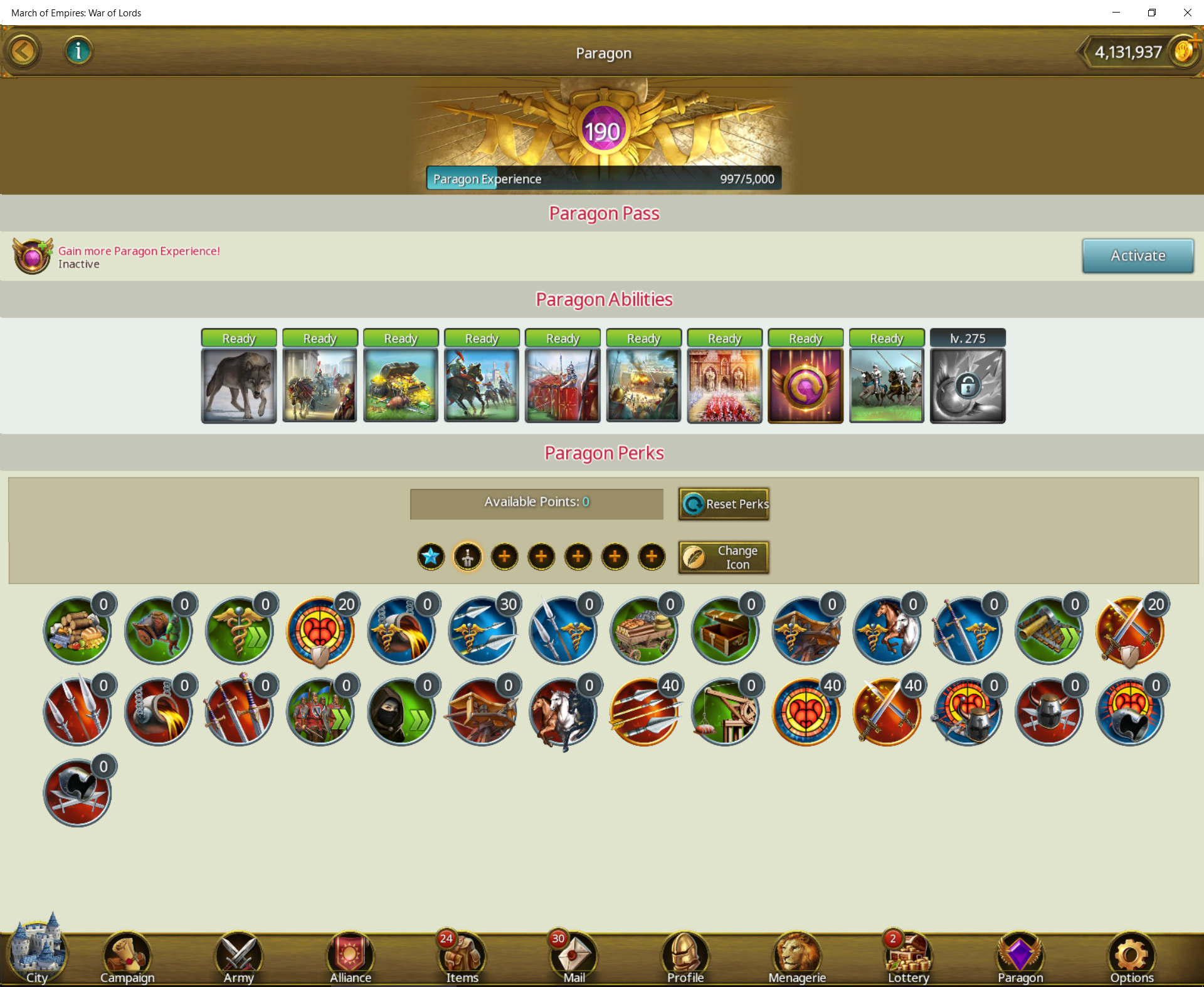 Paragon 190 Configuration with maximum power for army + archers + encounters – March Of Empires – War Of Lords